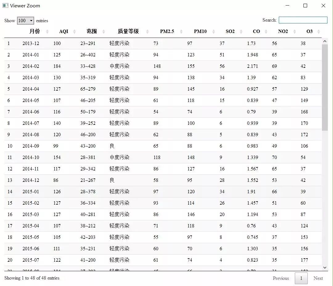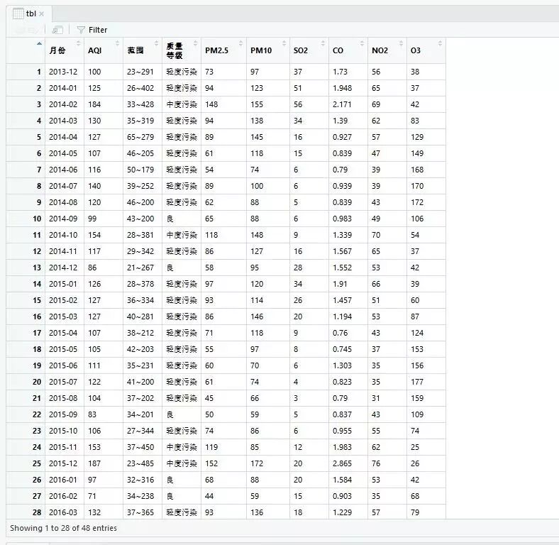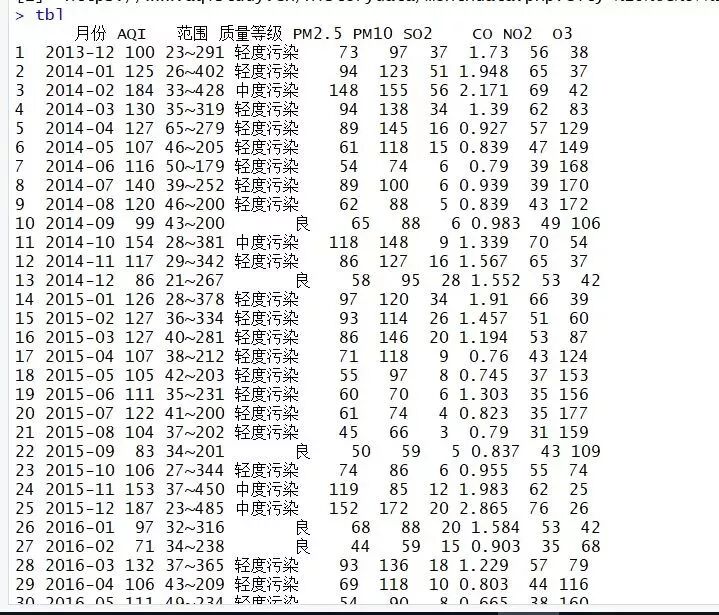 [1] 月份 AQI 范围 质量等级 PM2.5 PM10 SO2 CO NO2 O3