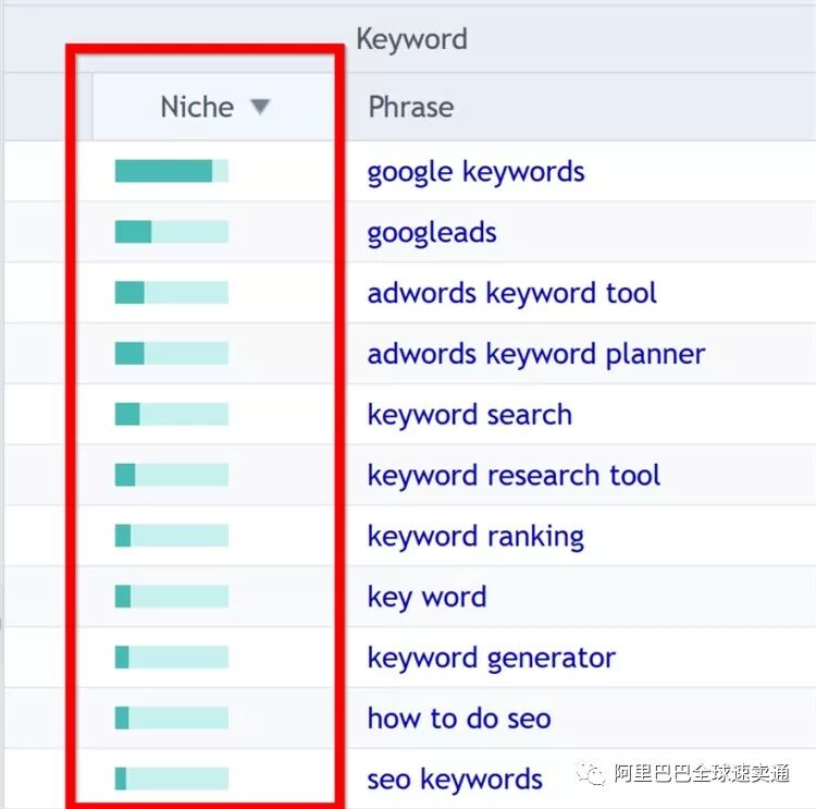 此栏显示的是关键词的竞争、每月搜索量和广告情况,深绿色条越长,关键词越好。