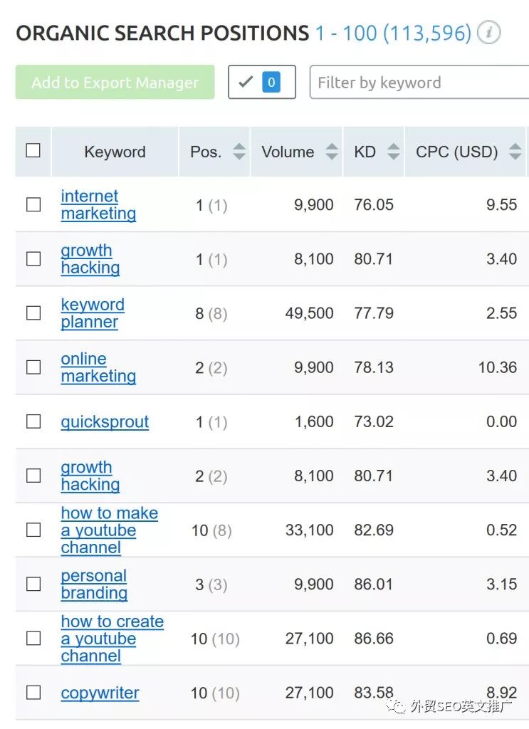 最后,得到竞争对手自然排名的关键词列表,从中选取有价值的关键词就OK了。