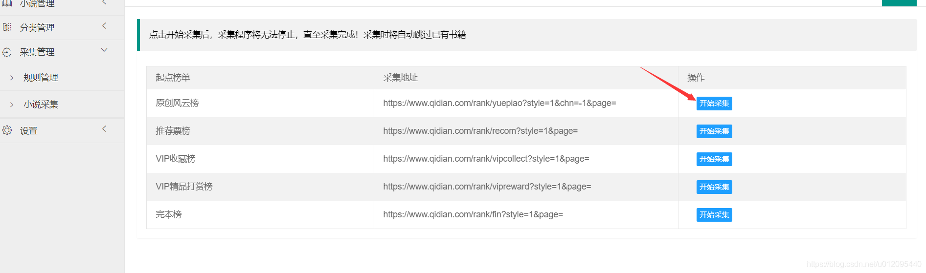 安装完成后,在下面的采集管理中单击小说集以采集小说. 配置了采集规则,并且自动从起点小说站点采集了小说. 如果是linux服务器,请配置以下文件的public \ static \ images \ books_img读写权限
