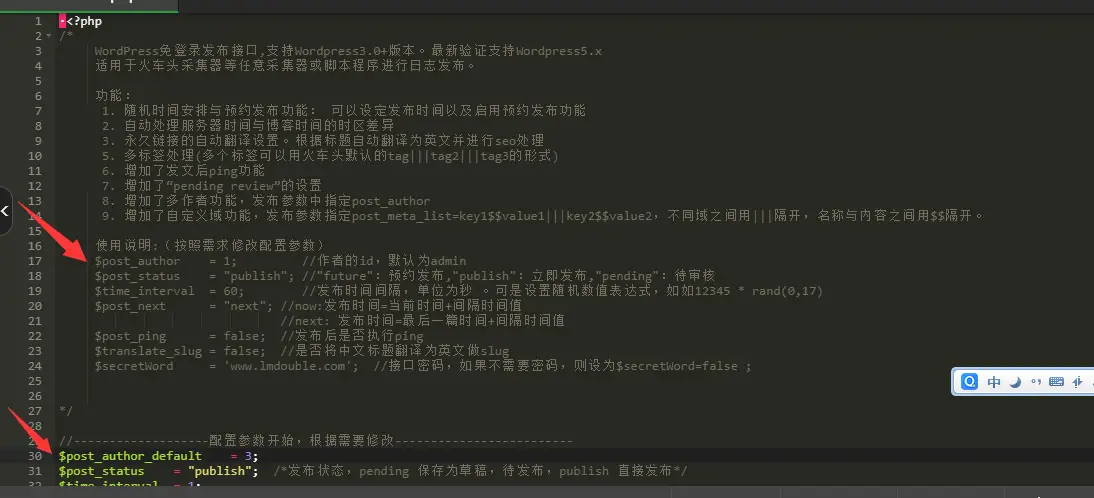 2. 修改post.php文件,如下图,大约第54行,$secretWord ='yudouyudou'; 是你自己的密码,这里是一个全局变量,发布时要填写。