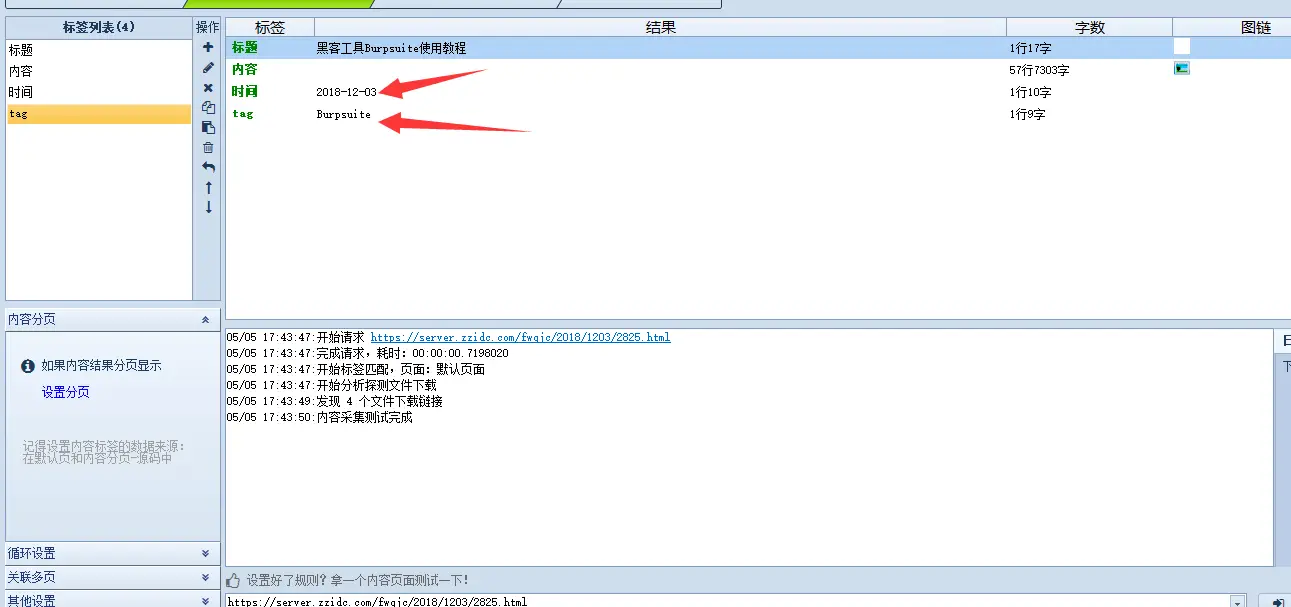 8、设置完成后,如果不知道设置是否正确,可以点击上图中的测试按钮。如果设置正确,将列出列表URL下的所有文章名称和对应的网址,如下图所示: